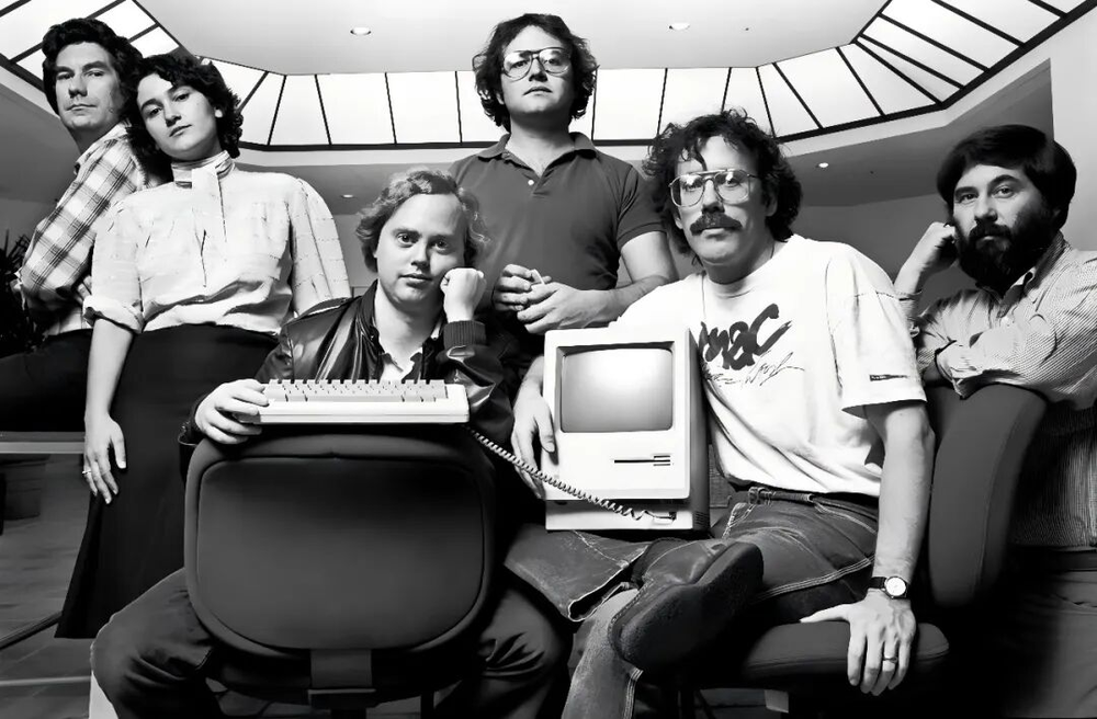 1984年,Mac创始团队:乔治·克罗、乔安娜·霍夫曼、伯勒尔·史密斯、安迪·赫兹菲尔德、比尔·阿特金森、杰里·马诺克(自左至右)